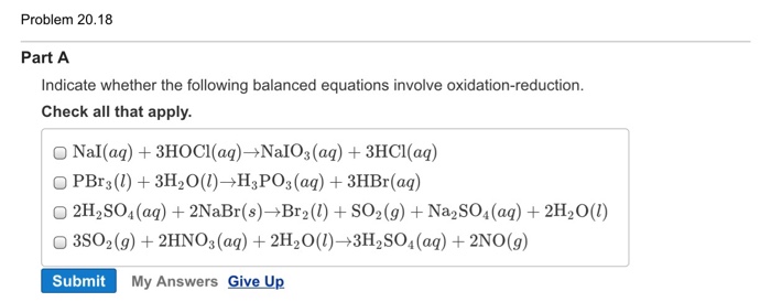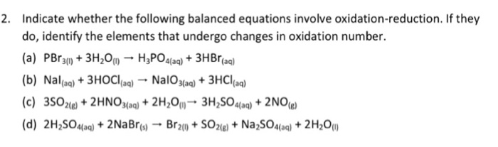 Indicate whether the following balanced equations involve oxidation-reduction. APBr3 l 3H2O lH3PO3 aq 3HBr aq bNaI aq 3HOCl aqNaIO3 aq HCl aq c3SO2 g 2HNO3 aq 2H2O l3H2SO4 aq 2NO g d 2H2SO4 aq 2NaBr sBr2 l Question. Indicate whether the following balanced equations involve oxidation-reductio 0810.